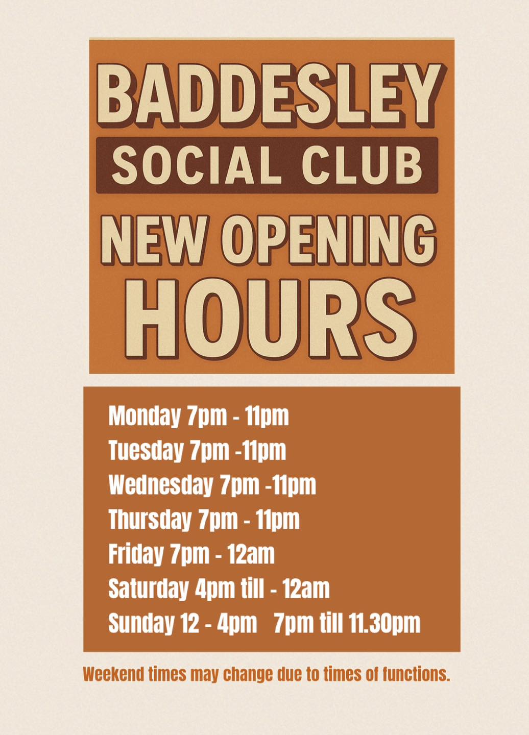 From the 6th January 2025, we are now charging for the room for out-of-hour functions. This includes Friday, Saturday, and Sunday afternoons. This is only a small charge of £30 and will be deducted from the standard £50 room deposit meaning that only £20 will be returned to you 7 days after your function. We make exceptions for special out-of-hours events like fundraising activities or funerals.